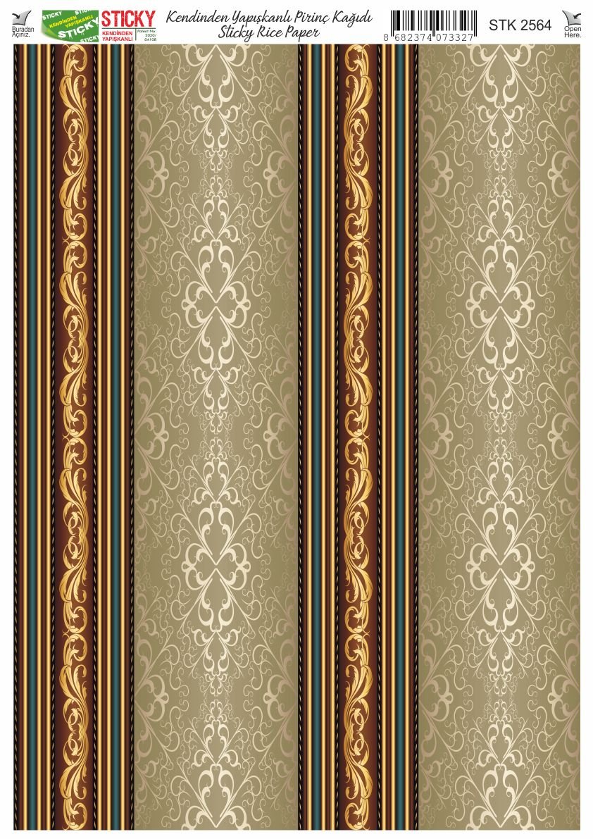 Scky Rice Paper (Self-Adhesive Rice Paper) It is printed on textured and thin paper that made from rice straw and is used for decoupage works. With its selfadhesive feature, it does not require glue. You can easily paste it on the area you want and apply painng, relief, foil and varnish on it. You can visit our web page for other Scky models