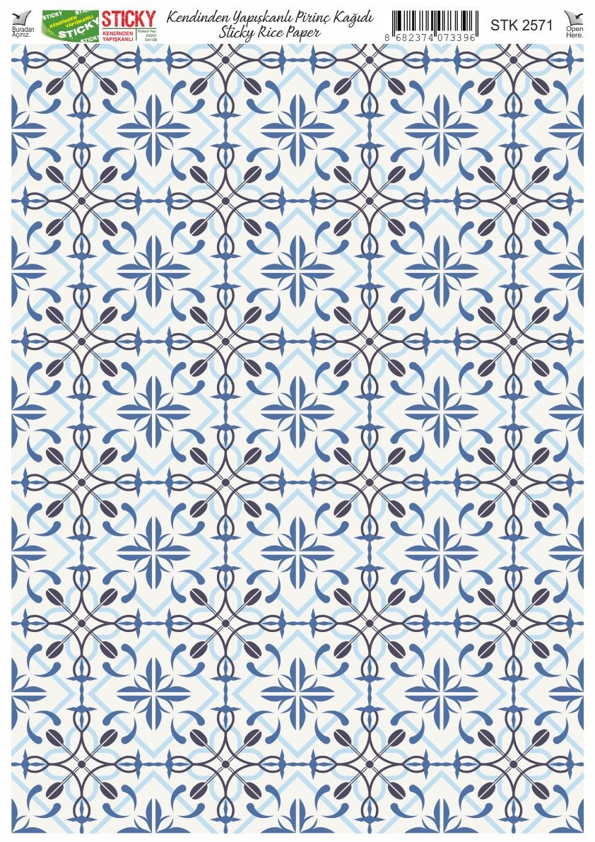 Scky Rice Paper (Self-Adhesive Rice Paper) It is printed on textured and thin paper that made from rice straw and is used for decoupage works. With its selfadhesive feature, it does not require glue. You can easily paste it on the area you want and apply painng, relief, foil and varnish on it. You can visit our web page for other Scky models
