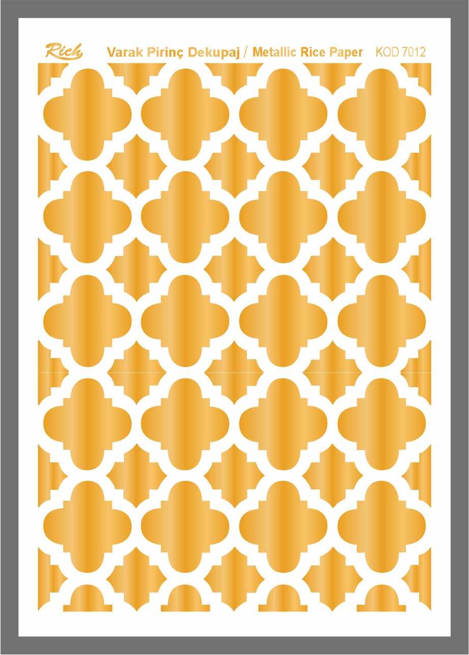 Paper designs made using metallic leaf foils are printed on very thin papers made from rice stalks. It is perfect for special decoupage works where metalized appearances are required. With Rich Magic Decoupage Glue, those can be easily adhered to the preferred surfaces, and Rich Water Based Varnishes can be applied to them.