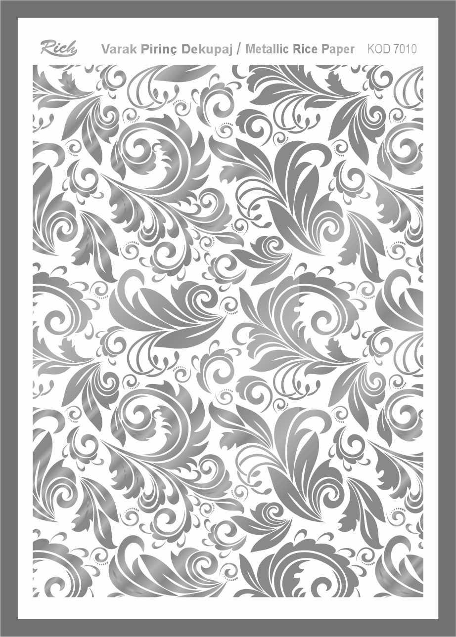 Paper designs made using metallic leaf foils are printed on very thin papers made from rice stalks. It is perfect for special decoupage works where metalized appearances are required. With Rich Magic Decoupage Glue, those can be easily adhered to the preferred surfaces, and Rich Water Based Varnishes can be applied to them.
