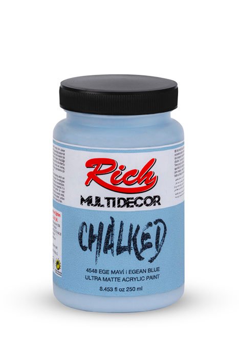 Rich Multi-Decor Chalked series are water-based, odorless paints that can be applied on every surface for decorative purposes. They give a silky, matte appearance on the applied surface. It is applied directly without dilution. It should be shaken for 1 min. before each use. The colors can be intermixed. Due to its high-pigment composition, it ensures a clarity in 2-3 coats at an average. It leaves no brush marks behind. It is suitable for application with rollers. When renovating your furniture with Multi-Decor Chalked paints, there is no need for sandpaper, surface preparation before the application, or applying another product. Along with its rich color range, it is available in 4 different volumes; namely 100cc/250cc/500cc/1250cc.