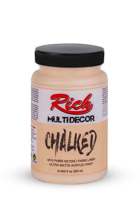 Rich Multi-Decor Chalked series are water-based, odorless paints that can be applied on every surface for decorative purposes. They give a silky, matte appearance on the applied surface. It is applied directly without dilution. It should be shaken for 1 min. before each use. The colors can be intermixed. Due to its high-pigment composition, it ensures a clarity in 2-3 coats at an average. It leaves no brush marks behind. It is suitable for application with rollers. When renovating your furniture with Multi-Decor Chalked paints, there is no need for sandpaper, surface preparation before the application, or applying another product. Along with its rich color range, it is available in 4 different volumes; namely 100cc/250cc/500cc/1250cc.