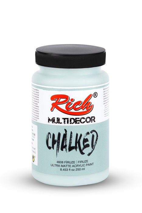Rich Multi-Decor Chalked series are water-based, odorless paints that can be applied on every surface for decorative purposes. They give a silky, matte appearance on the applied surface. It is applied directly without dilution. It should be shaken for 1 min. before each use. The colors can be intermixed. Due to its high-pigment composition, it ensures a clarity in 2-3 coats at an average. It leaves no brush marks behind. It is suitable for application with rollers. When renovating your furniture with Multi-Decor Chalked paints, there is no need for sandpaper, surface preparation before the application, or applying another product. Along with its rich color range, it is available in 4 different volumes; namely 100cc/250cc/500cc/1250cc.