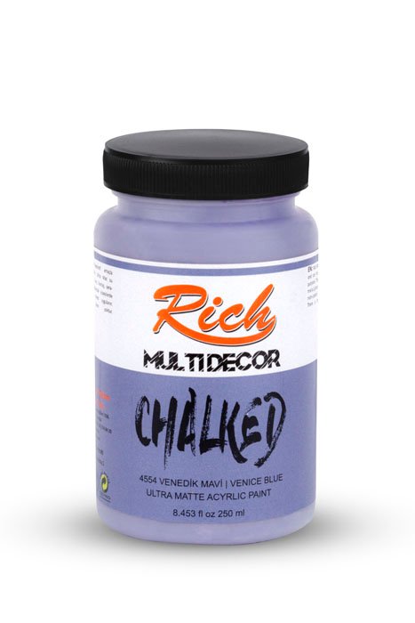 Rich Multi-Decor Chalked series are water-based, odorless paints that can be applied on every surface for decorative purposes. They give a silky, matte appearance on the applied surface. It is applied directly without dilution. It should be shaken for 1 min. before each use. The colors can be intermixed. Due to its high-pigment composition, it ensures a clarity in 2-3 coats at an average. It leaves no brush marks behind. It is suitable for application with rollers. When renovating your furniture with Multi-Decor Chalked paints, there is no need for sandpaper, surface preparation before the application, or applying another product. Along with its rich color range, it is available in 4 different volumes; namely 100cc/250cc/500cc/1250cc.