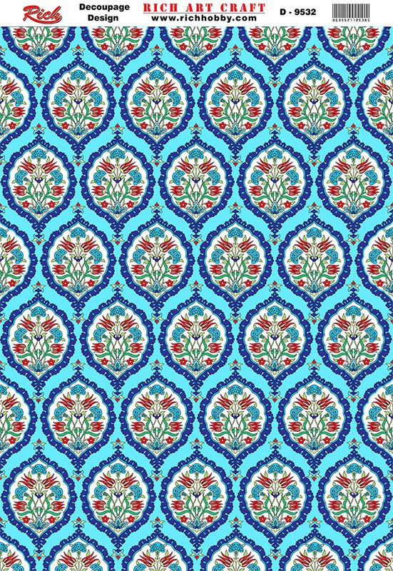 The designs that are printed on the special decoupage paper sheets are ideal to use in decoupage works. With Rich Magic Decoupage Glue, you can easily stick it to the surface you want and apply paints, relief pastes, foils, and varnishes on those. For other decoupage models, please visit our decoupage paper web pages.