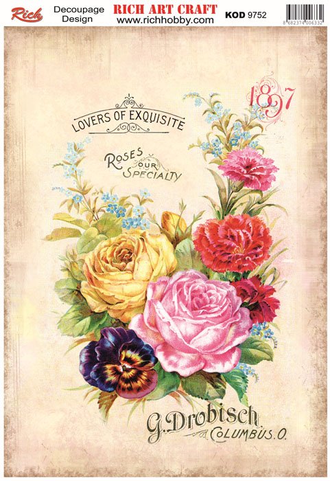 The designs that are printed on the special decoupage paper sheets are ideal to use in decoupage works. With Rich Magic Decoupage Glue, you can easily stick it to the surface you want and apply paints, relief pastes, foils, and varnishes on those. For other decoupage models, please visit our decoupage paper web pages.