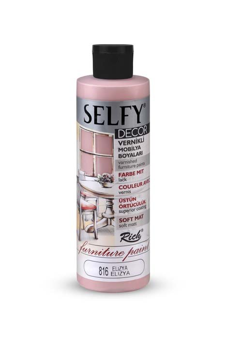 Rich Selfy Decor is for decorative purposes and they are water-based paints with intrinsic varnish that can be applied on wooden, varnished, and lacquered furniture surfaces. They give a sıft matte appearance to the applied surface. The net appearance is achieved after an average of 2-3 coats depending on the surface. No dilution is needed. It is ready for direct use. The colors can be intermixed. It is suitable for application with rollers and brushes. When painting varnished surfaces and furniture makeover products with Selfy Decor, there is no need for preparation or sanding. It is sufficient that the surface to be painted is clean and dry. One must wait at least 4-6 hours between the coats and the product should be shaken before each use. Full drying time for the surface colored with Selfy Decor is 4-5 days. Along with a variety of 38 colors, it is available in 3 different volumes; namely 240cc/500cc/1250cc. It complies with CE and EN71 norms.