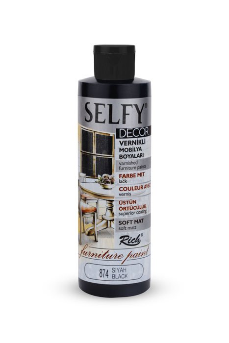 Rich Selfy Decor is for decorative purposes and they are water-based paints with intrinsic varnish that can be applied on wooden, varnished, and lacquered furniture surfaces. They give a sıft matte appearance to the applied surface. The net appearance is achieved after an average of 2-3 coats depending on the surface. No dilution is needed. It is ready for direct use. The colors can be intermixed. It is suitable for application with rollers and brushes. When painting varnished surfaces and furniture makeover products with Selfy Decor, there is no need for preparation or sanding. It is sufficient that the surface to be painted is clean and dry. One must wait at least 4-6 hours between the coats and the product should be shaken before each use. Full drying time for the surface colored with Selfy Decor is 4-5 days. Along with a variety of 38 colors, it is available in 3 different volumes; namely 240cc/500cc/1250cc. It complies with CE and EN71 norms.