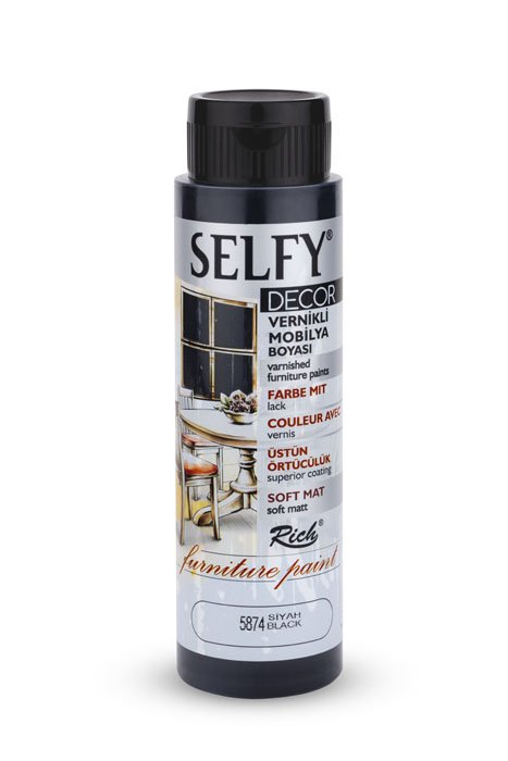 Rich Selfy Decor is for decorative purposes and they are water-based paints with intrinsic varnish that can be applied on wooden, varnished, and lacquered furniture surfaces. They give a sıft matte appearance to the applied surface. The net appearance is achieved after an average of 2-3 coats depending on the surface. No dilution is needed. It is ready for direct use. The colors can be intermixed. It is suitable for application with rollers and brushes. When painting varnished surfaces and furniture makeover products with Selfy Decor, there is no need for preparation or sanding. It is sufficient that the surface to be painted is clean and dry. One must wait at least 4-6 hours between the coats and the product should be shaken before each use. Full drying time for the surface colored with Selfy Decor is 4-5 days. Along with a variety of 38 colors, it is available in 3 different volumes; namely 240cc/500cc/1250cc. It complies with CE and EN71 norms.