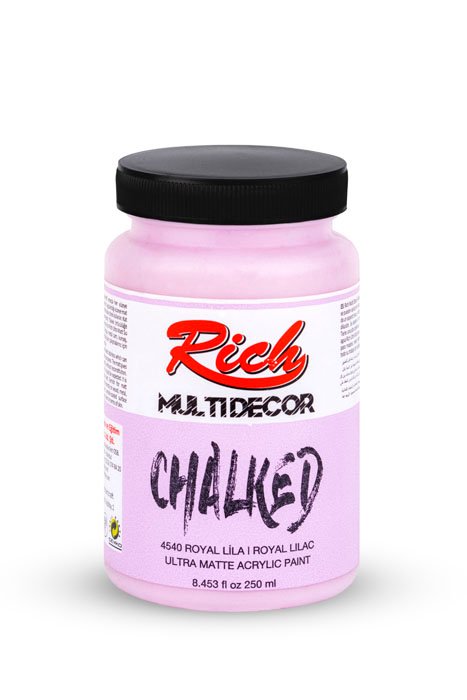 Rich Multi-Decor Chalked series are water-based, odorless paints that can be applied on every surface for decorative purposes. They give a silky, matte appearance on the applied surface. It is applied directly without dilution. It should be shaken for 1 min. before each use. The colors can be intermixed. Due to its high-pigment composition, it ensures a clarity in 2-3 coats at an average. It leaves no brush marks behind. It is suitable for application with rollers. When renovating your furniture with Multi-Decor Chalked paints, there is no need for sandpaper, surface preparation before the application, or applying another product. Along with its rich color range, it is available in 4 different volumes; namely 100cc/250cc/500cc/1250cc.