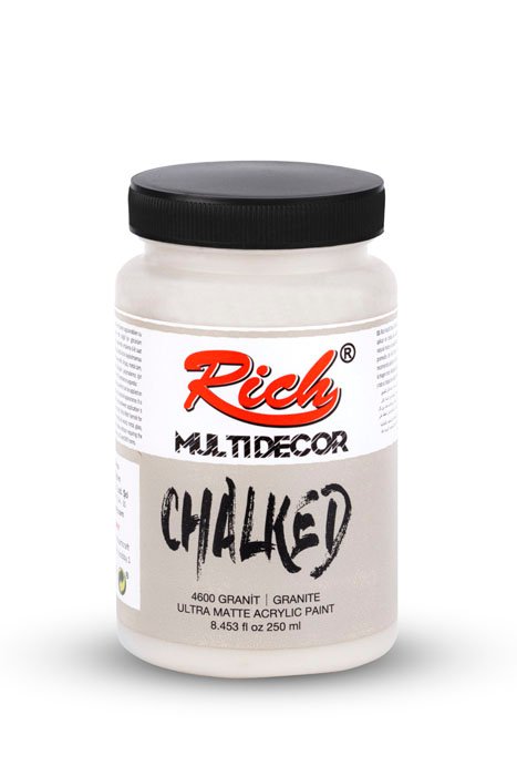 Rich Multi-Decor Chalked series are water-based, odorless paints that can be applied on every surface for decorative purposes. They give a silky, matte appearance on the applied surface. It is applied directly without dilution. It should be shaken for 1 min. before each use. The colors can be intermixed. Due to its high-pigment composition, it ensures a clarity in 2-3 coats at an average. It leaves no brush marks behind. It is suitable for application with rollers. When renovating your furniture with Multi-Decor Chalked paints, there is no need for sandpaper, surface preparation before the application, or applying another product. Along with its rich color range, it is available in 4 different volumes; namely 100cc/250cc/500cc/1250cc.