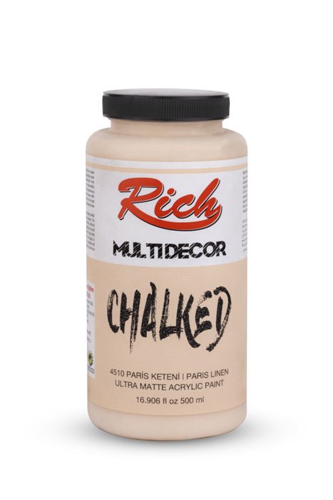 Rich Multi-Decor Chalked series are water-based, odorless paints that can be applied on every surface for decorative purposes. They give a silky, matte appearance on the applied surface. It is applied directly without dilution. It should be shaken for 1 min. before each use. The colors can be intermixed. Due to its high-pigment composition, it ensures a clarity in 2-3 coats at an average. It leaves no brush marks behind. It is suitable for application with rollers. When renovating your furniture with Multi-Decor Chalked paints, there is no need for sandpaper, surface preparation before the application, or applying another product. Along with its rich color range, it is available in 4 different volumes; namely 100cc/250cc/500cc/1250cc.