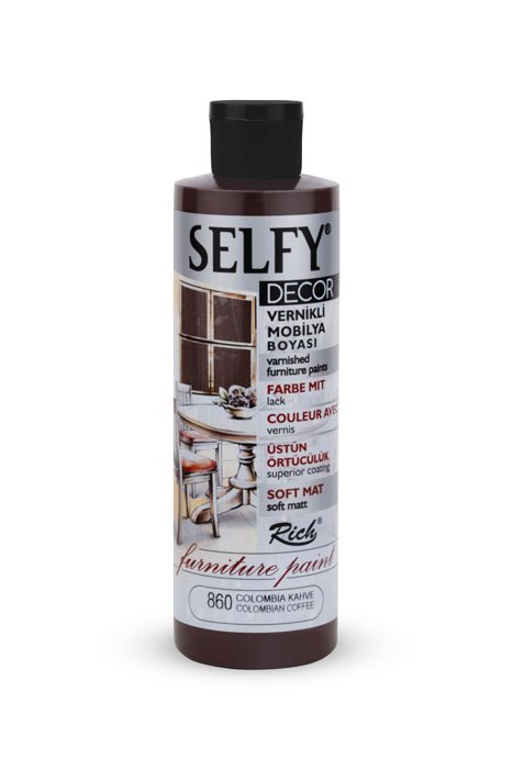 Rich Selfy Decor is for decorative purposes and they are water-based paints with intrinsic varnish that can be applied on wooden, varnished, and lacquered furniture surfaces. They give a sıft matte appearance to the applied surface. The net appearance is achieved after an average of 2-3 coats depending on the surface. No dilution is needed. It is ready for direct use. The colors can be intermixed. It is suitable for application with rollers and brushes. When painting varnished surfaces and furniture makeover products with Selfy Decor, there is no need for preparation or sanding. It is sufficient that the surface to be painted is clean and dry. One must wait at least 4-6 hours between the coats and the product should be shaken before each use. Full drying time for the surface colored with Selfy Decor is 4-5 days. Along with a variety of 38 colors, it is available in 3 different volumes; namely 240cc/500cc/1250cc. It complies with CE and EN71 norms.
