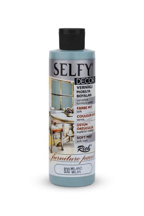 Rich Selfy Decor is for decorative purposes and they are water-based paints with intrinsic varnish that can be applied on wooden, varnished, and lacquered furniture surfaces. They give a sıft matte appearance to the applied surface. The net appearance is achieved after an average of 2-3 coats depending on the surface. No dilution is needed. It is ready for direct use. The colors can be intermixed. It is suitable for application with rollers and brushes. When painting varnished surfaces and furniture makeover products with Selfy Decor, there is no need for preparation or sanding. It is sufficient that the surface to be painted is clean and dry. One must wait at least 4-6 hours between the coats and the product should be shaken before each use. Full drying time for the surface colored with Selfy Decor is 4-5 days. Along with a variety of 38 colors, it is available in 3 different volumes; namely 240cc/500cc/1250cc. It complies with CE and EN71 norms.