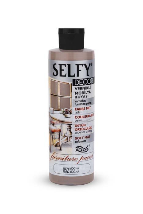 Rich Selfy Decor is for decorative purposes and they are water-based paints with intrinsic varnish that can be applied on wooden, varnished, and lacquered furniture surfaces. They give a sıft matte appearance to the applied surface. The net appearance is achieved after an average of 2-3 coats depending on the surface. No dilution is needed. It is ready for direct use. The colors can be intermixed. It is suitable for application with rollers and brushes. When painting varnished surfaces and furniture makeover products with Selfy Decor, there is no need for preparation or sanding. It is sufficient that the surface to be painted is clean and dry. One must wait at least 4-6 hours between the coats and the product should be shaken before each use. Full drying time for the surface colored with Selfy Decor is 4-5 days. Along with a variety of 38 colors, it is available in 3 different volumes; namely 240cc/500cc/1250cc. It complies with CE and EN71 norms.
