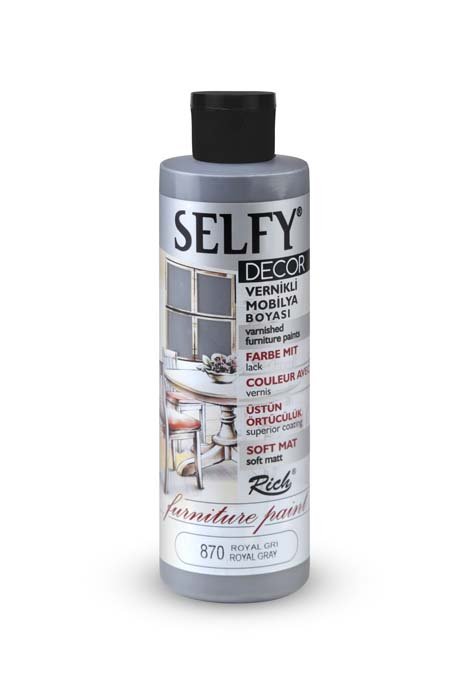 Rich Selfy Decor is for decorative purposes and they are water-based paints with intrinsic varnish that can be applied on wooden, varnished, and lacquered furniture surfaces. They give a sıft matte appearance to the applied surface. The net appearance is achieved after an average of 2-3 coats depending on the surface. No dilution is needed. It is ready for direct use. The colors can be intermixed. It is suitable for application with rollers and brushes. When painting varnished surfaces and furniture makeover products with Selfy Decor, there is no need for preparation or sanding. It is sufficient that the surface to be painted is clean and dry. One must wait at least 4-6 hours between the coats and the product should be shaken before each use. Full drying time for the surface colored with Selfy Decor is 4-5 days. Along with a variety of 38 colors, it is available in 3 different volumes; namely 240cc/500cc/1250cc. It complies with CE and EN71 norms.