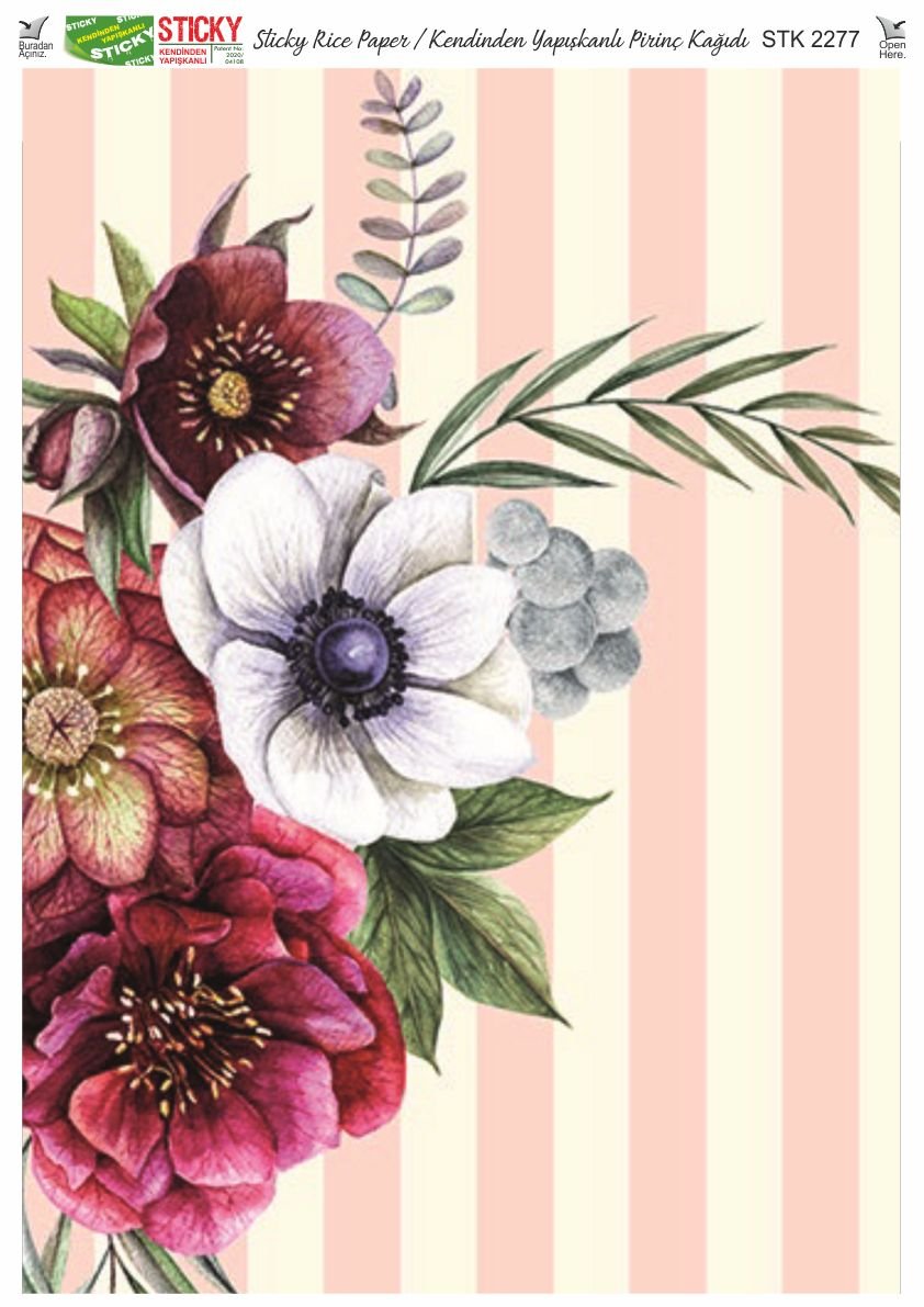 Scky Rice Paper (Self-Adhesive Rice Paper) It is printed on textured and thin paper that made from rice straw and is used for decoupage works. With its selfadhesive feature, it does not require glue. You can easily paste it on the area you want and apply painng, relief, foil and varnish on it. You can visit our web page for other Scky models