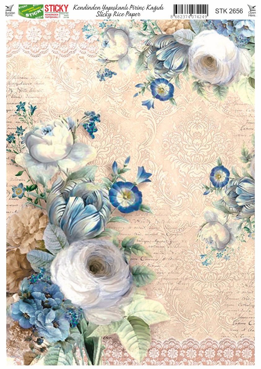 Scky Rice Paper (Self-Adhesive Rice Paper) It is printed on textured and thin paper that made from rice straw and is used for decoupage works. With its selfadhesive feature, it does not require glue. You can easily paste it on the area you want and apply painng, relief, foil and varnish on it. You can visit our web page for other Scky models
